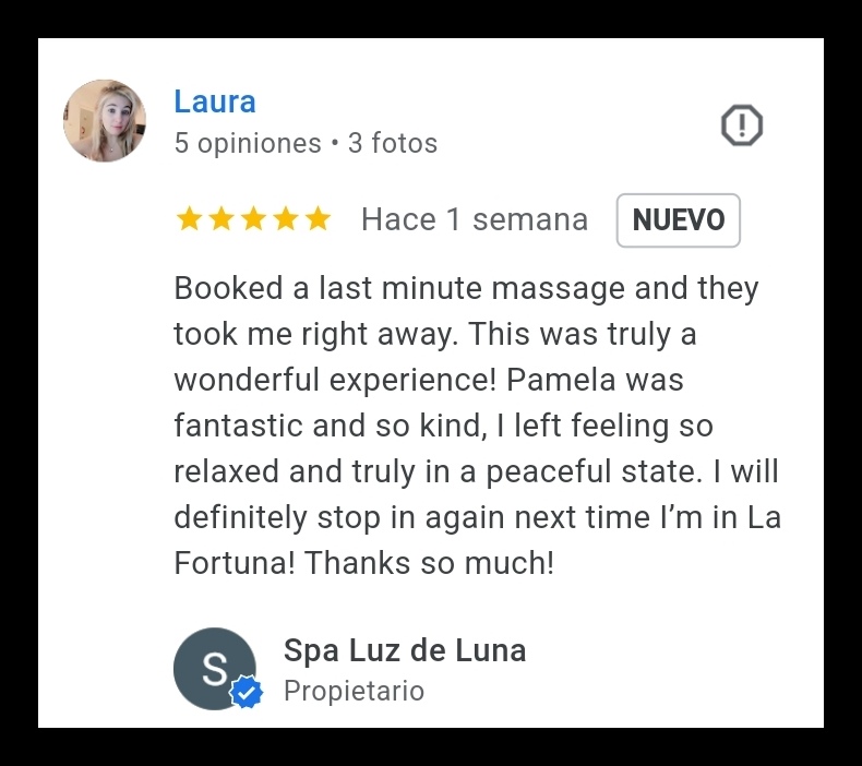 During my vacation in La Fortuna I was looking for some me time. I contacted Luz de Luna on messenger to ask for availabilities and prices. I came in yesterday for a 1 hour massage and ended up selecting a 1,5h massage + free facial. It was awesome! I strongly recommend this place and I am going back tomorrow for another massage ![]()